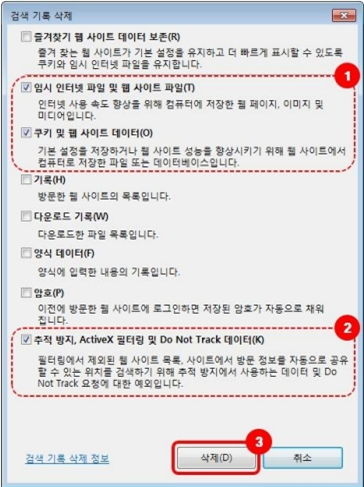 5. 임시인터넷 파일 , 쿠키 , ActiveX 필터링 및 추적 방지 데이터 3 항목만 체크 후 삭제를 클릭
