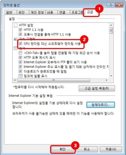 7. GPU 렌더링 대신소프트웨어 렌더링 사용 체크 (단, InternetExplorer8 이하 버전에서는 이 항목이 없습니다.)
